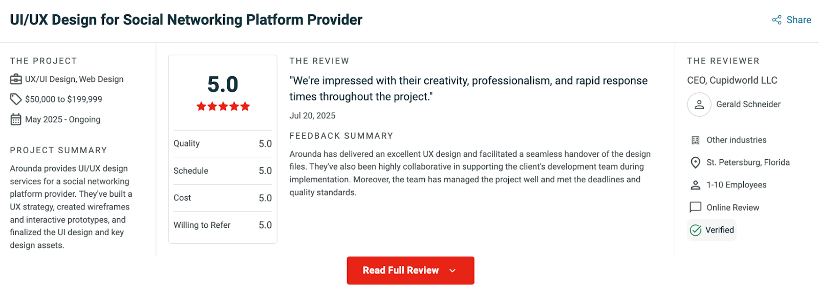 With 10+ years of experience and 350+ delivered projects, Arounda brings together strategic design and dependable development. The results show up in our 5.0 rating on Clutch, backed by reviews from teams who have been through the full process.