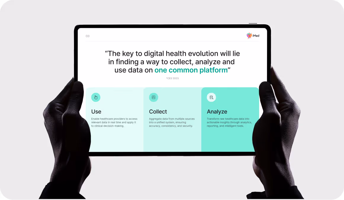 iMed had a fully built national e-health ecosystem but no clear way to present it to non-technical stakeholders. Our Arounda team designed a pitch deck with layered storytelling. We used data visualization, typographic hierarchy, and a restrained green palette to keep data-dense slides scannable and decision-ready.