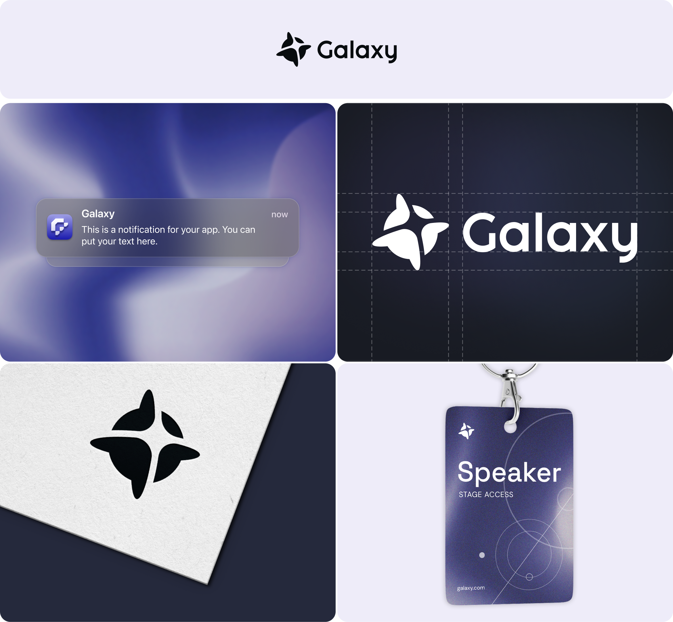 The logo combines an atom, electrons, and a star. It reflects Galaxy’s tech-first, dynamic identity. Deep space colors paired with soft lavender create a futuristic feel. Our brand designers applied visual identity across app screens, badges, and event materials to show how it will look in digital and real-world use.