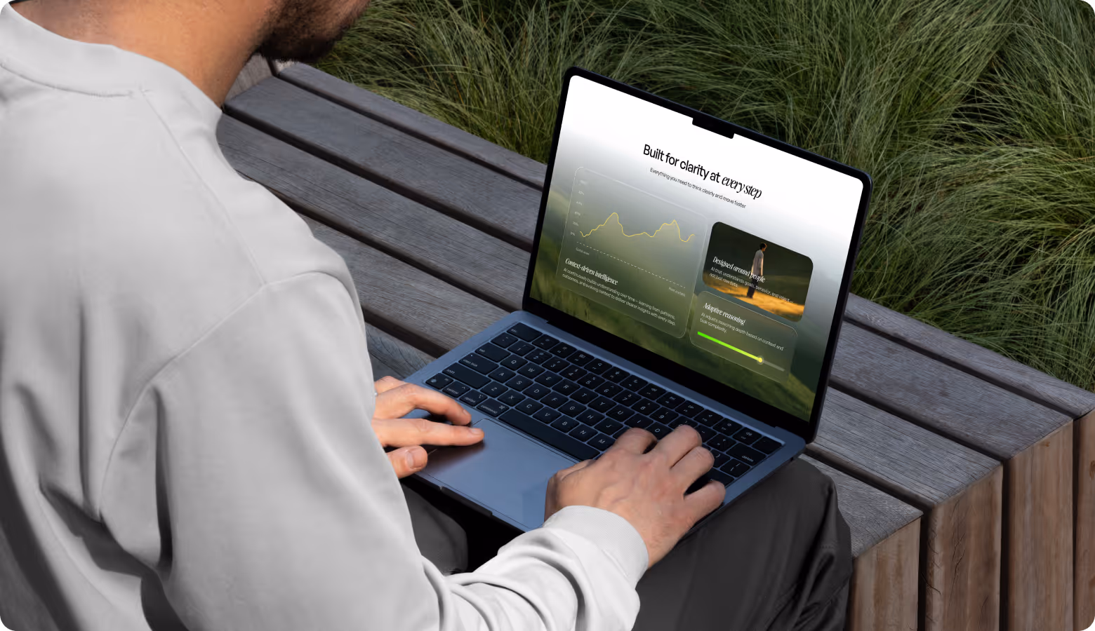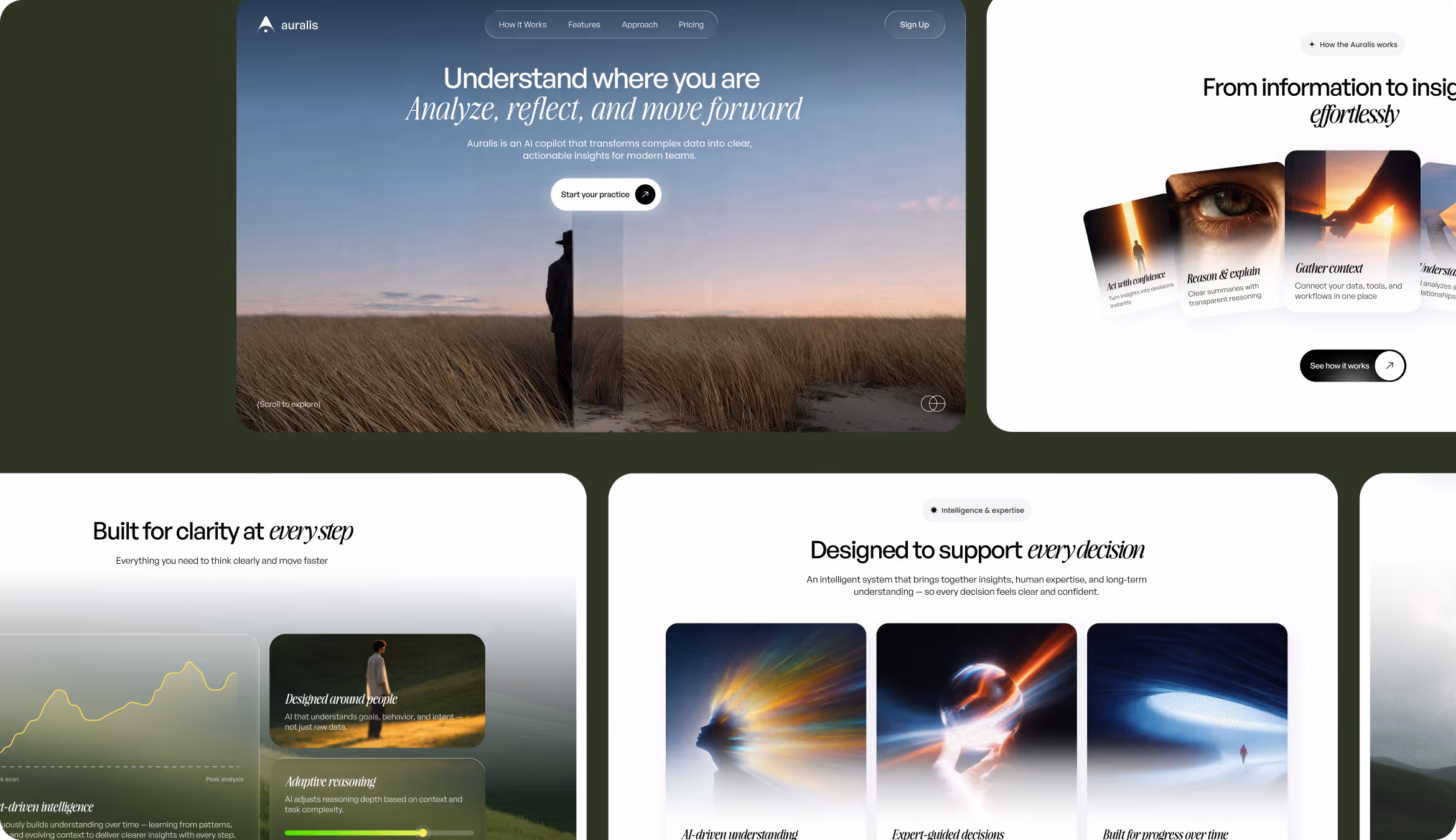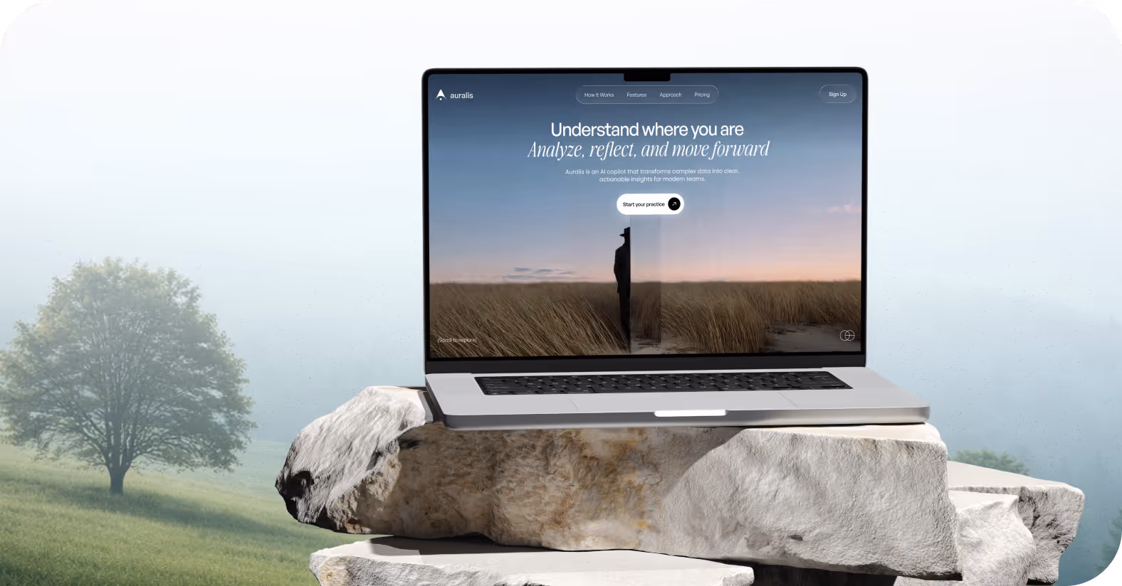 A UI/UX designer built the landing page with real photography, natural tones, and open space. This solution distanced Auralis from the dark and data-heavy aesthetics typical for AI products. The page follows a single conversion path: value statement, product logic, feature proof, pricing. Each section answers one question and advances the decision.