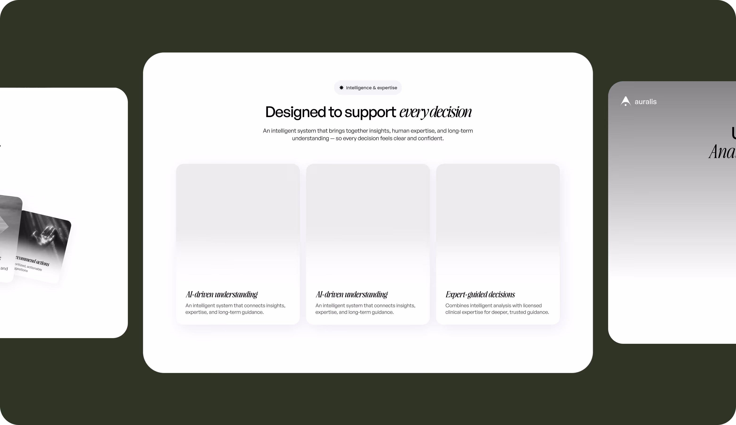 Arounda built a layered information architecture with high-level summaries first, expandable deep dives, and transparent AI reasoning at every level. The visual system separates AI-generated insights from expert-reviewed guidance. We used calm, structured design language that communicates trust.