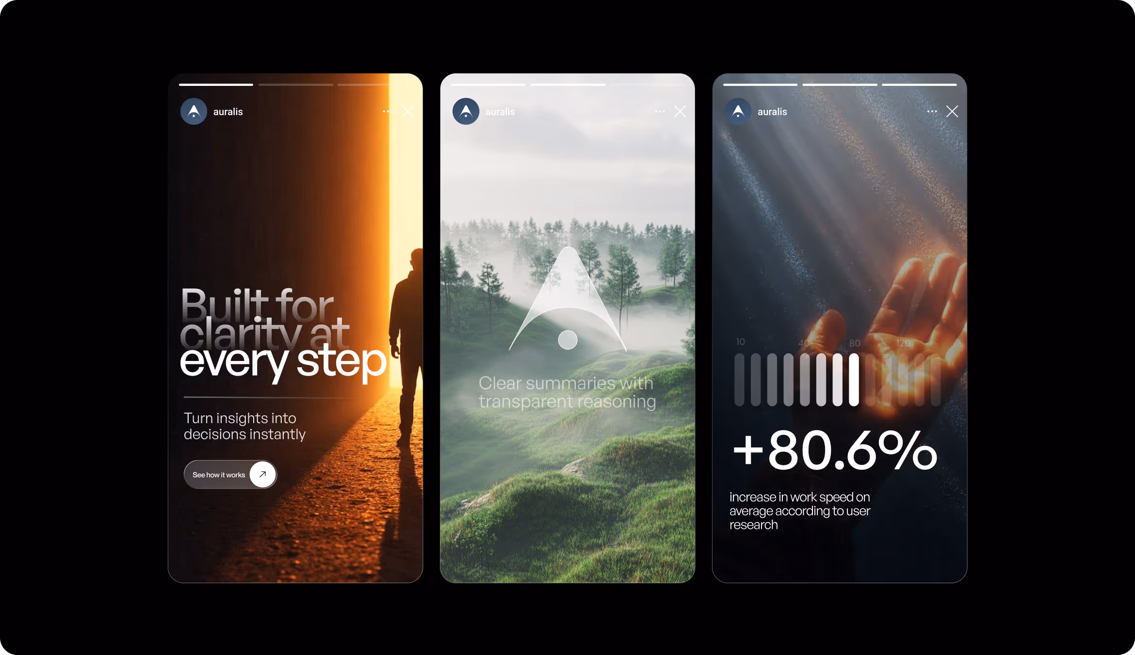 Our graphic designer developed unified social assets (stories, presentation screens, and branded visuals). They have full-bleed nature photography and human silhouettes instead of the interface screenshots and abstract gradients typical of competitor products. Each format carries one message, one metric, or one visual idea for clarity and recognition.