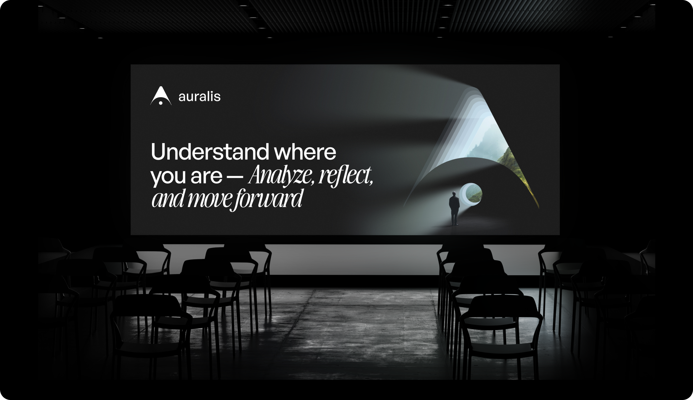 Our brand designer created the Auralis mark as a geometric arrow with a focal dot at the base. The upward form signals direction and decision. And the dot anchors attention on a single point of insight. The mark follows a strict grid construction, scales from app icon to full-screen placement, and strips detail to match how the product works.