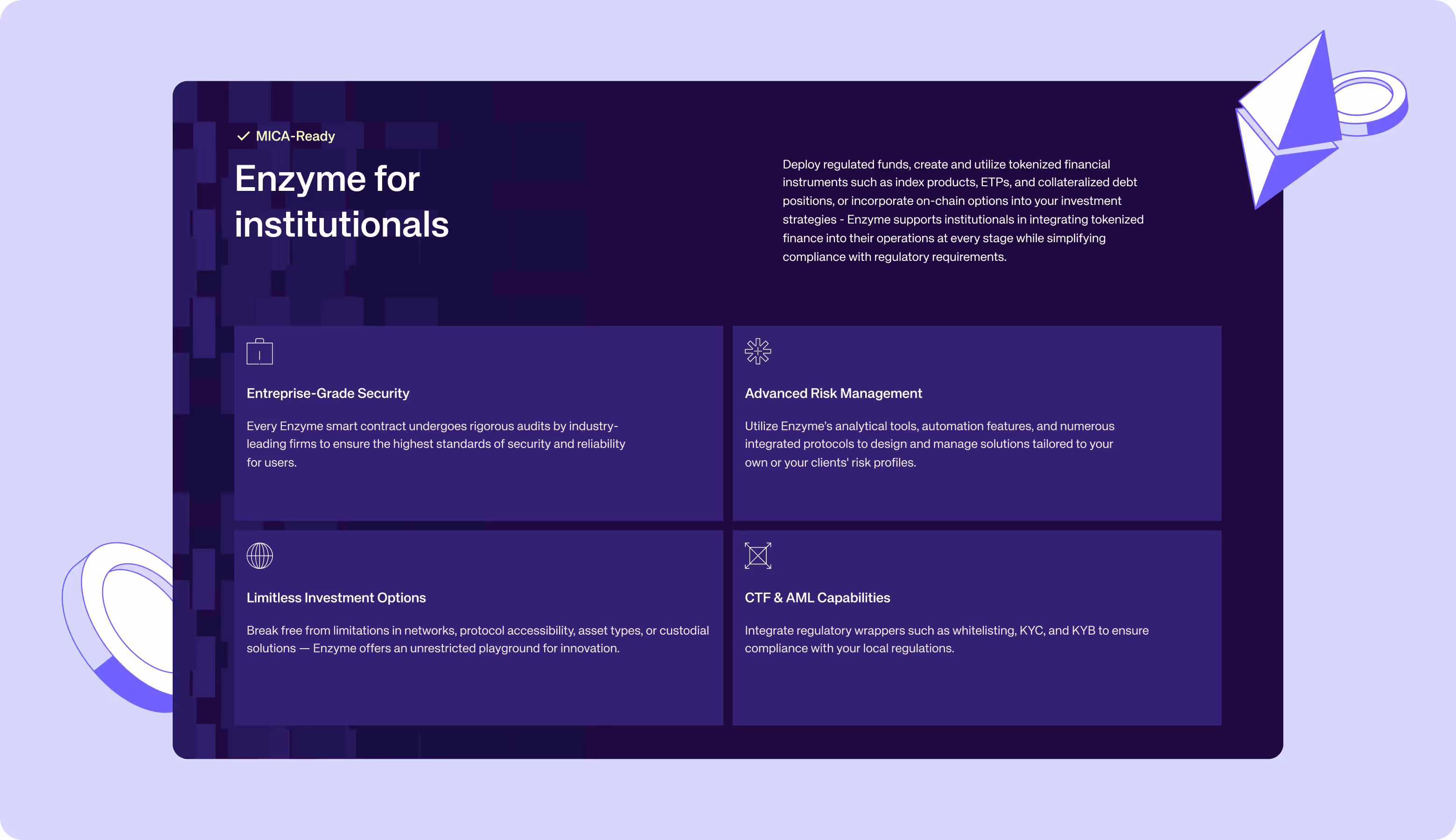Enzyme is a non-custodial DeFi platform that makes digital asset management simple and clear. It operates on Ethereum, supports 350+ assets, and integrates with various DeFi protocols. So, users can build scalable, automated investment strategies with ease.