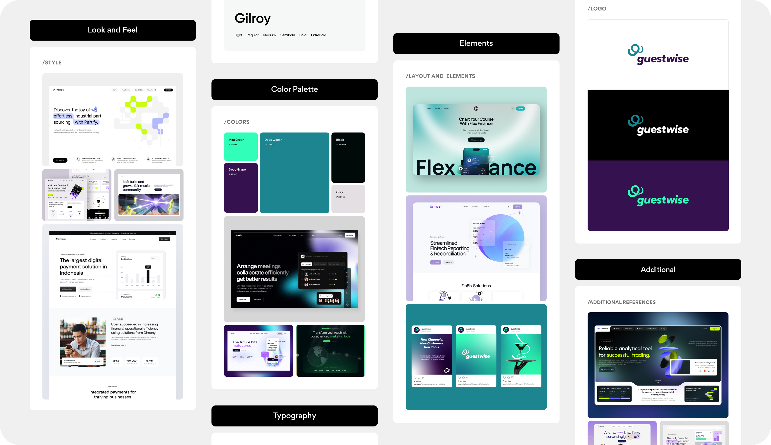 Competitor analysis showed dense layouts, heavy content blocks, and mixed visual styles that make their value hard to grasp. That’s why our team focused on simplicity, airiness, and structure. The moodboard defined a modern visual direction with whitespace, light backgrounds, subtle gradients, and hero contrasts that improve readability and strengthen the brand.