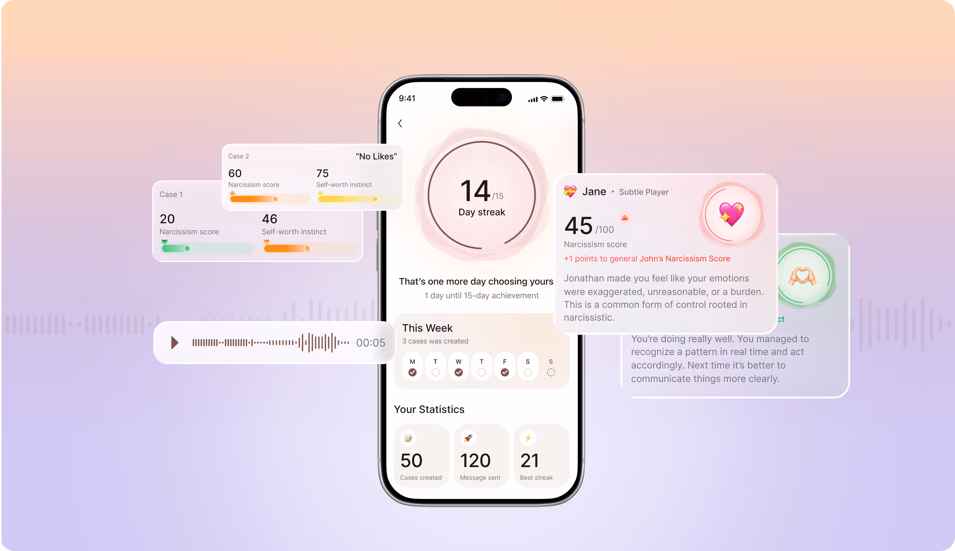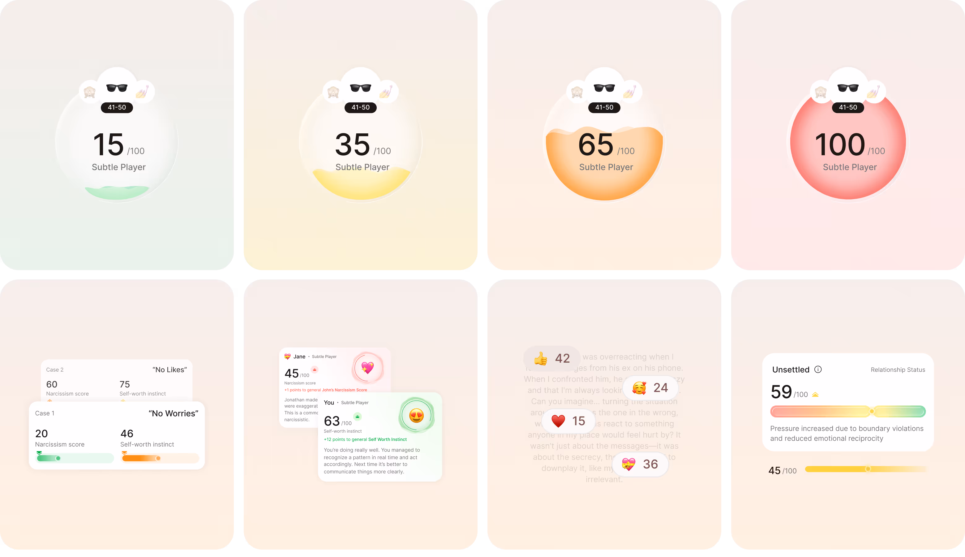 The narcissism score bubble shifts through four calm color states and communicates risk level without triggering an alarm. Users processing an abusive relationship don't need aggressive visuals amplifying that stress. So, emoji, indicators, background, and soft progress bars create a feeling of a safe digital space.