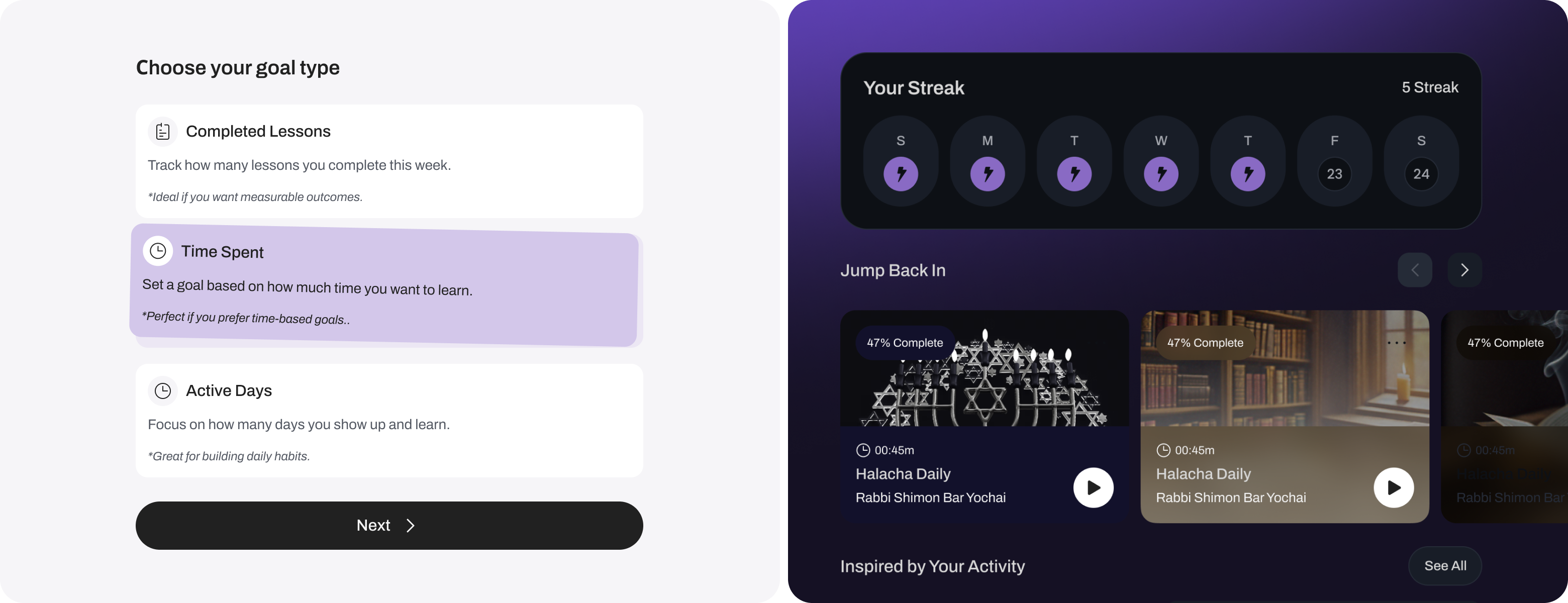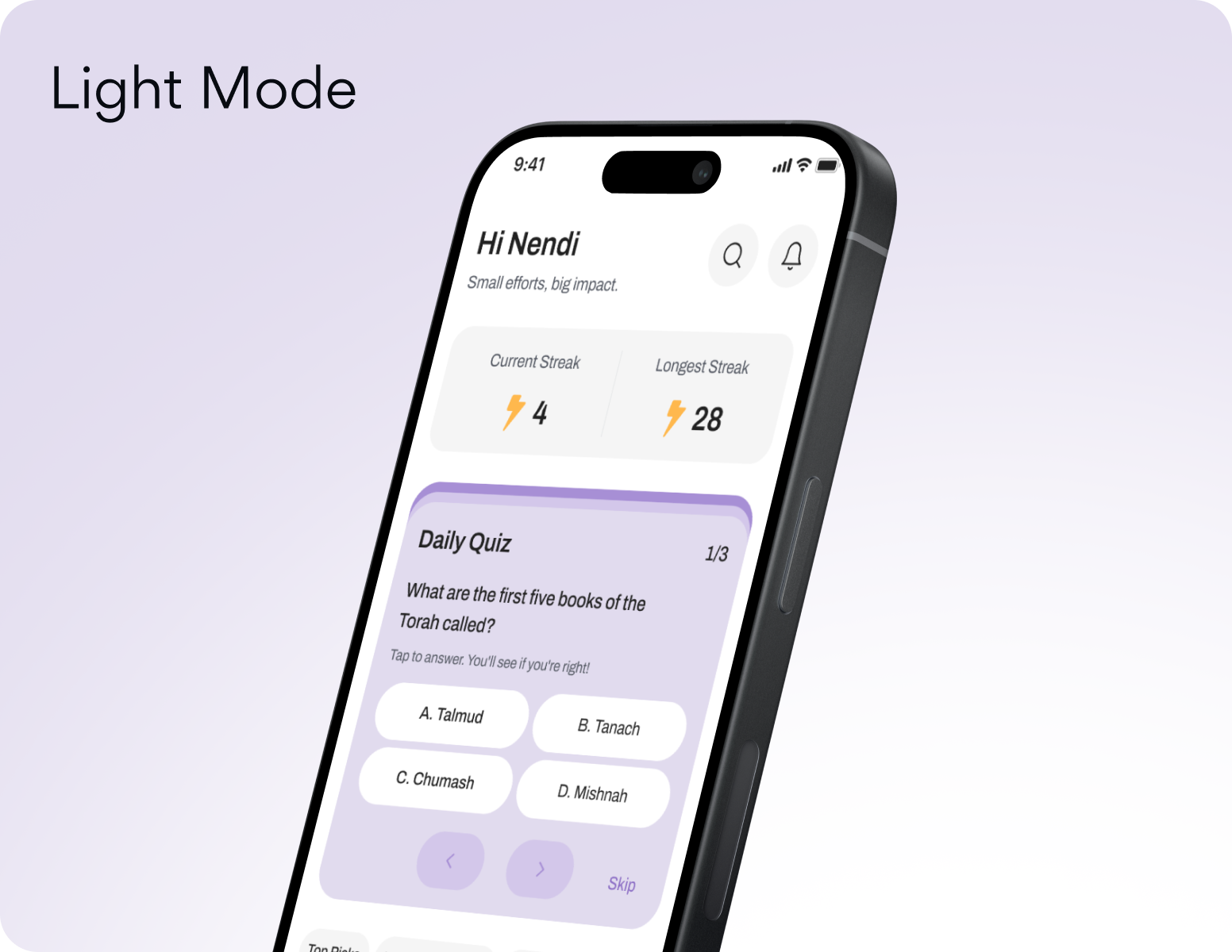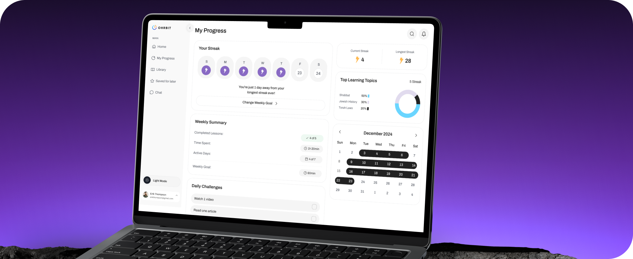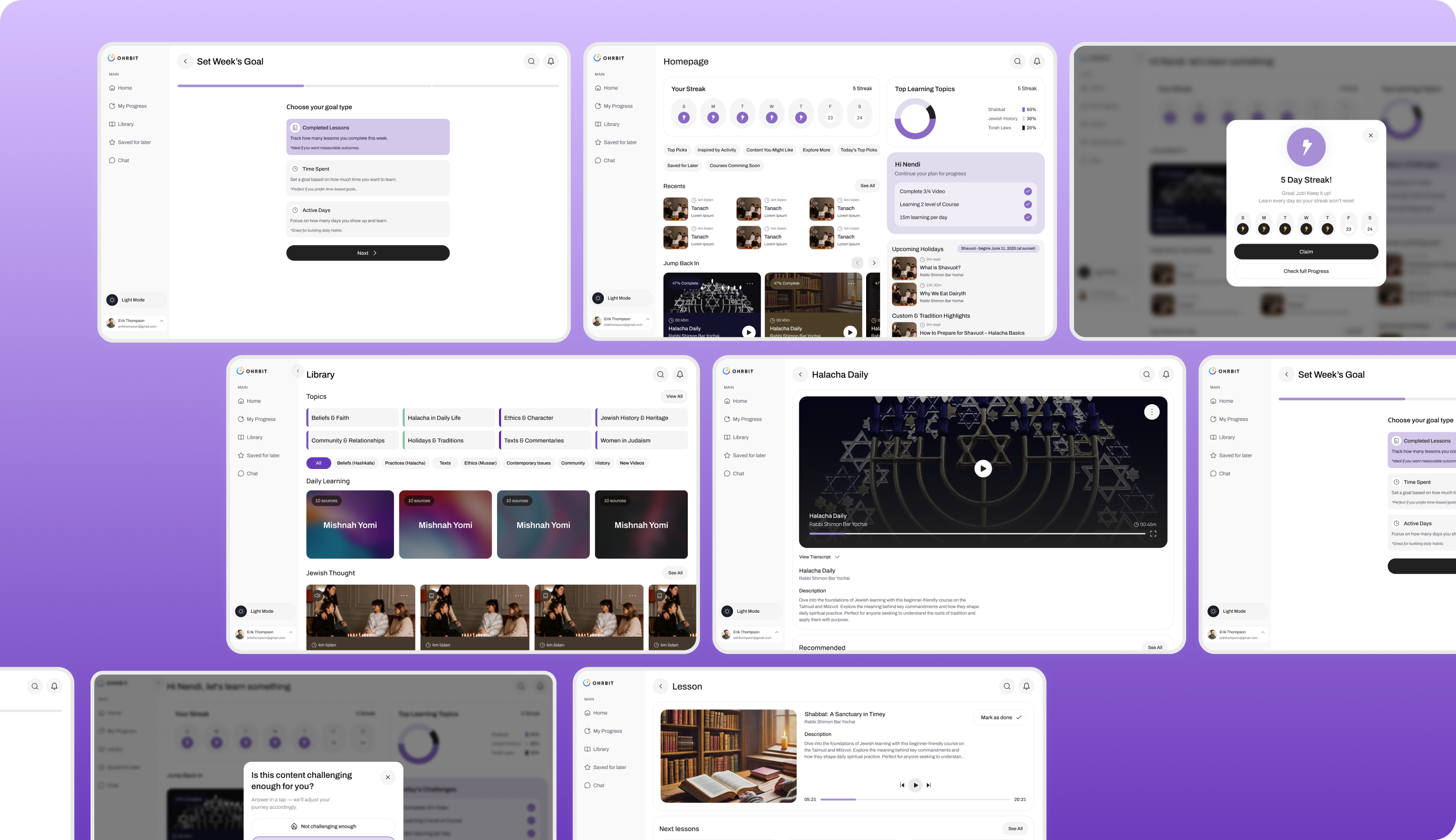 Ohrbit is an online learning platform for Jewish study, ethics, and traditions. They approached us to unify the design of web, mobile, and admin interfaces, creating a consistent experience across all platforms. We included accessible UI, personalized paths, quizzes, progress tracking, and smart tips.