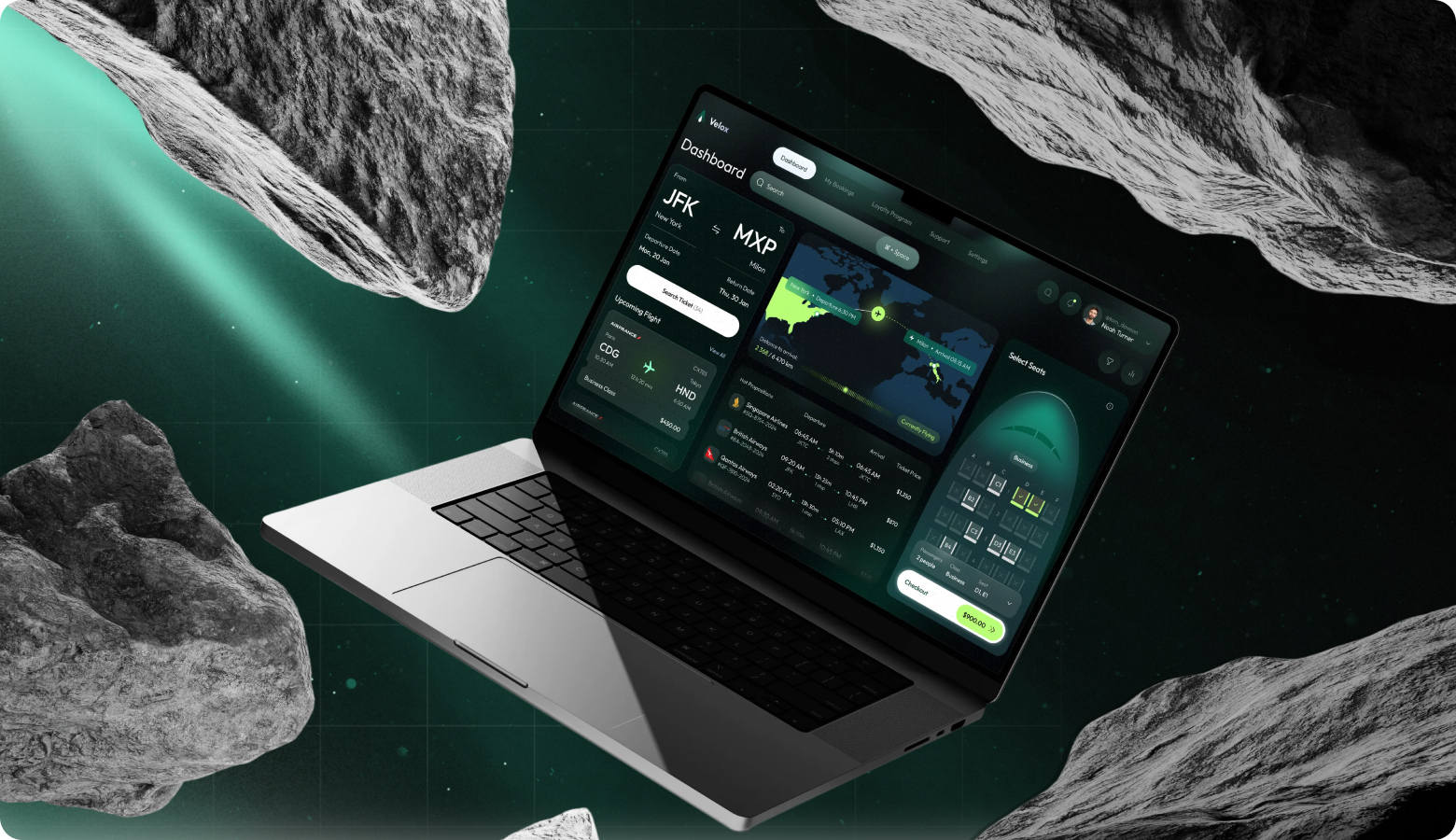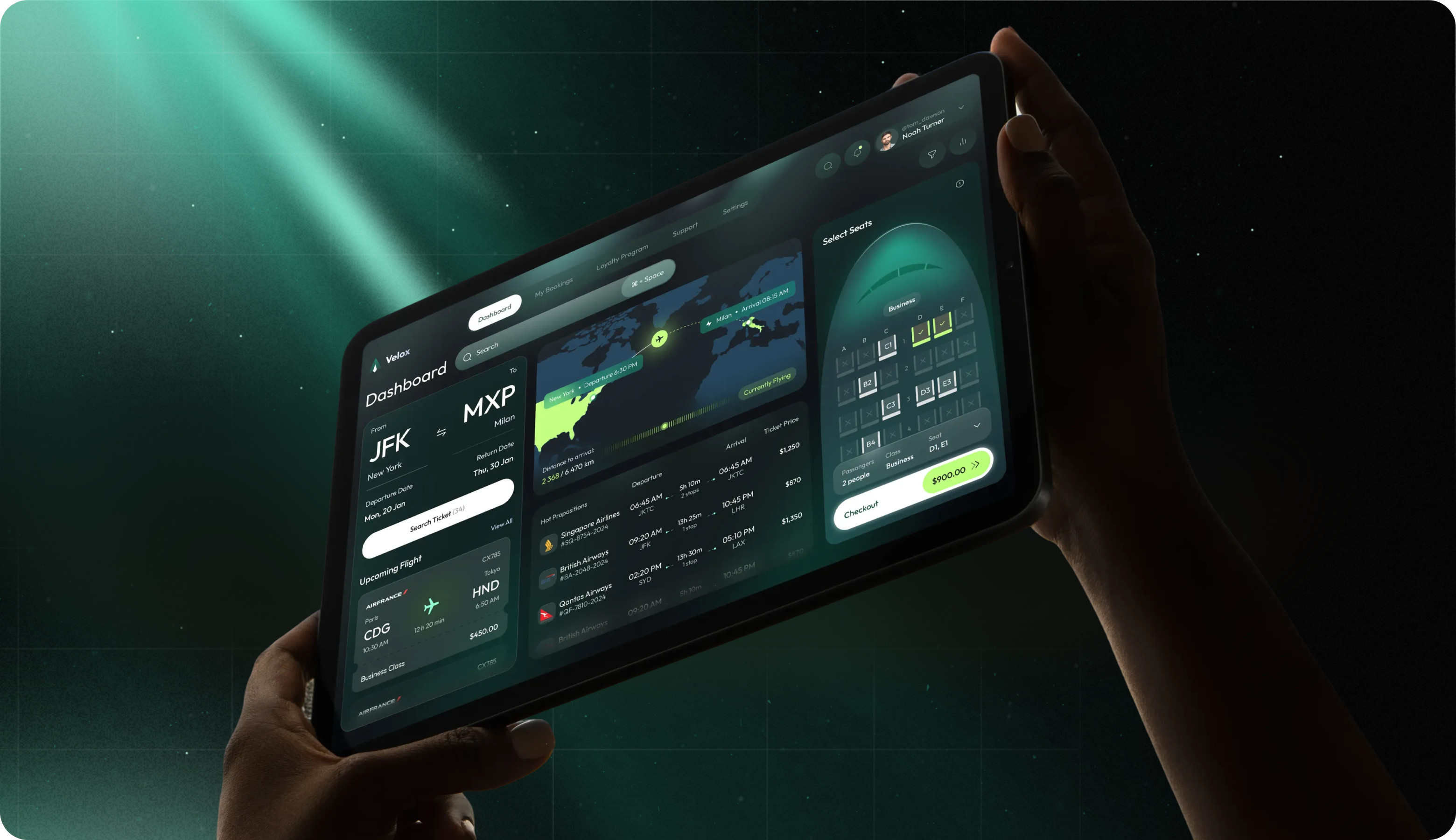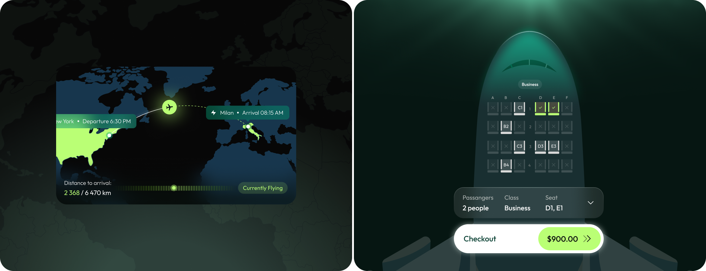 Our team designed the dashboard where flight search, comparison, seat selection, and checkout operate as integrated panels on a single screen. Each step doesn’t hide previous selections. Layered shadows and glow accents separate functional zones and direct attention in a left-to-right logic flow.