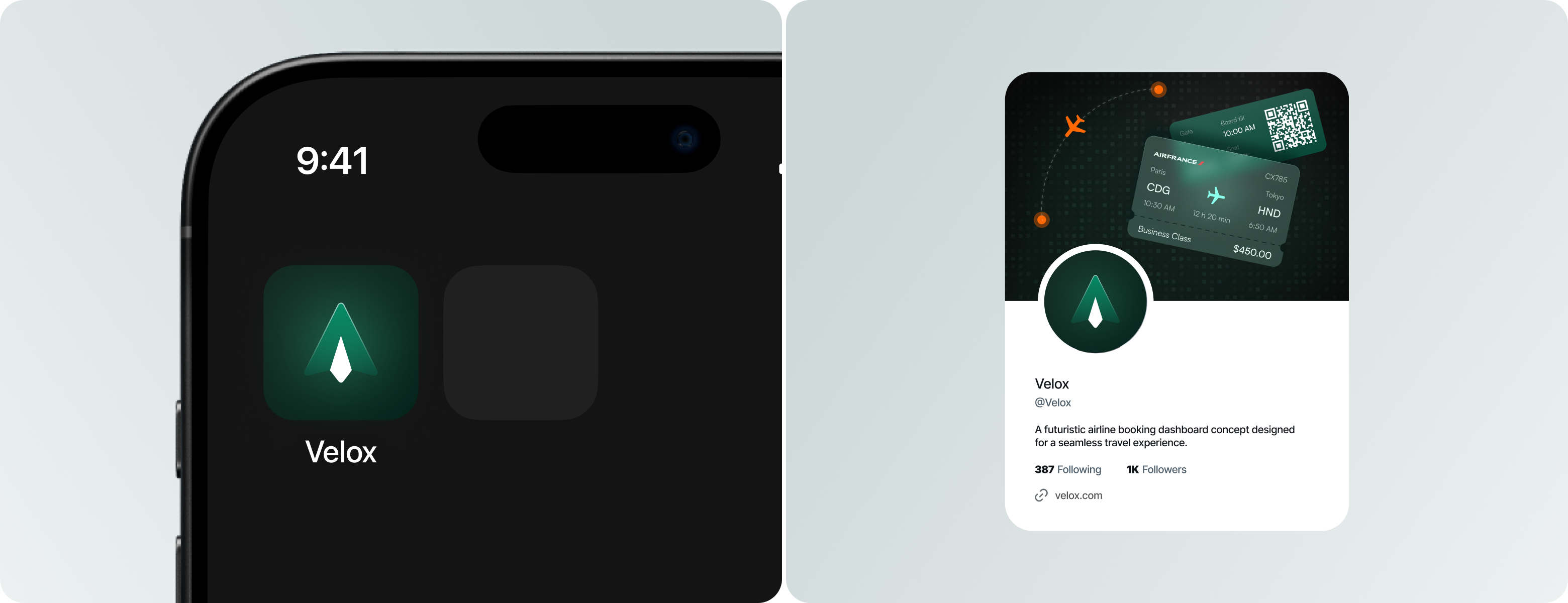 Arounda brand designer created a Velox mark that combined an upward arrow and an aircraft silhouette. It reinforces the brand's core idea of speed and precise direction. We built the logo on the same emerald-to-dark gradient used across the dashboard, so the brand identity feels like part of the user experience.