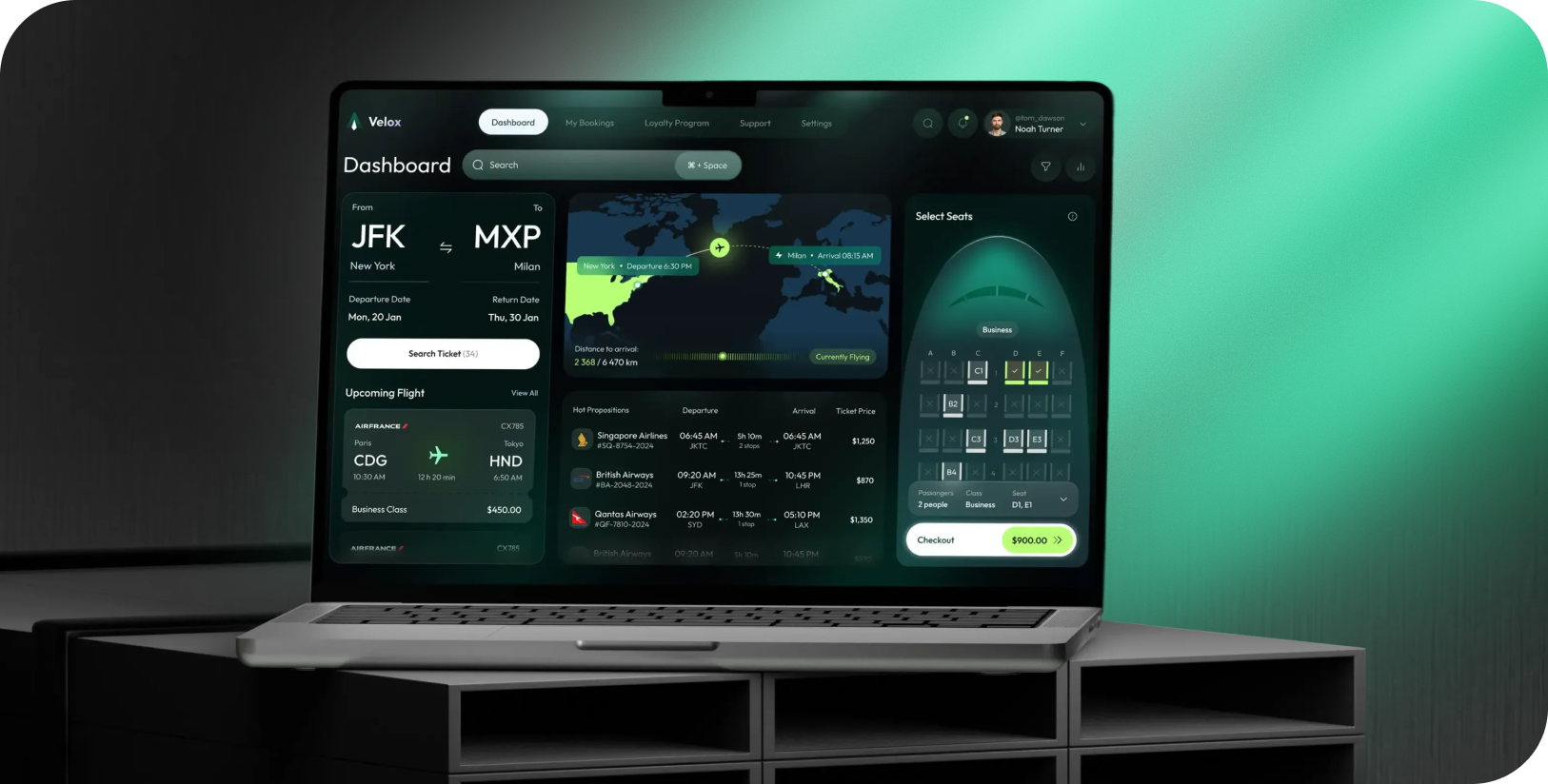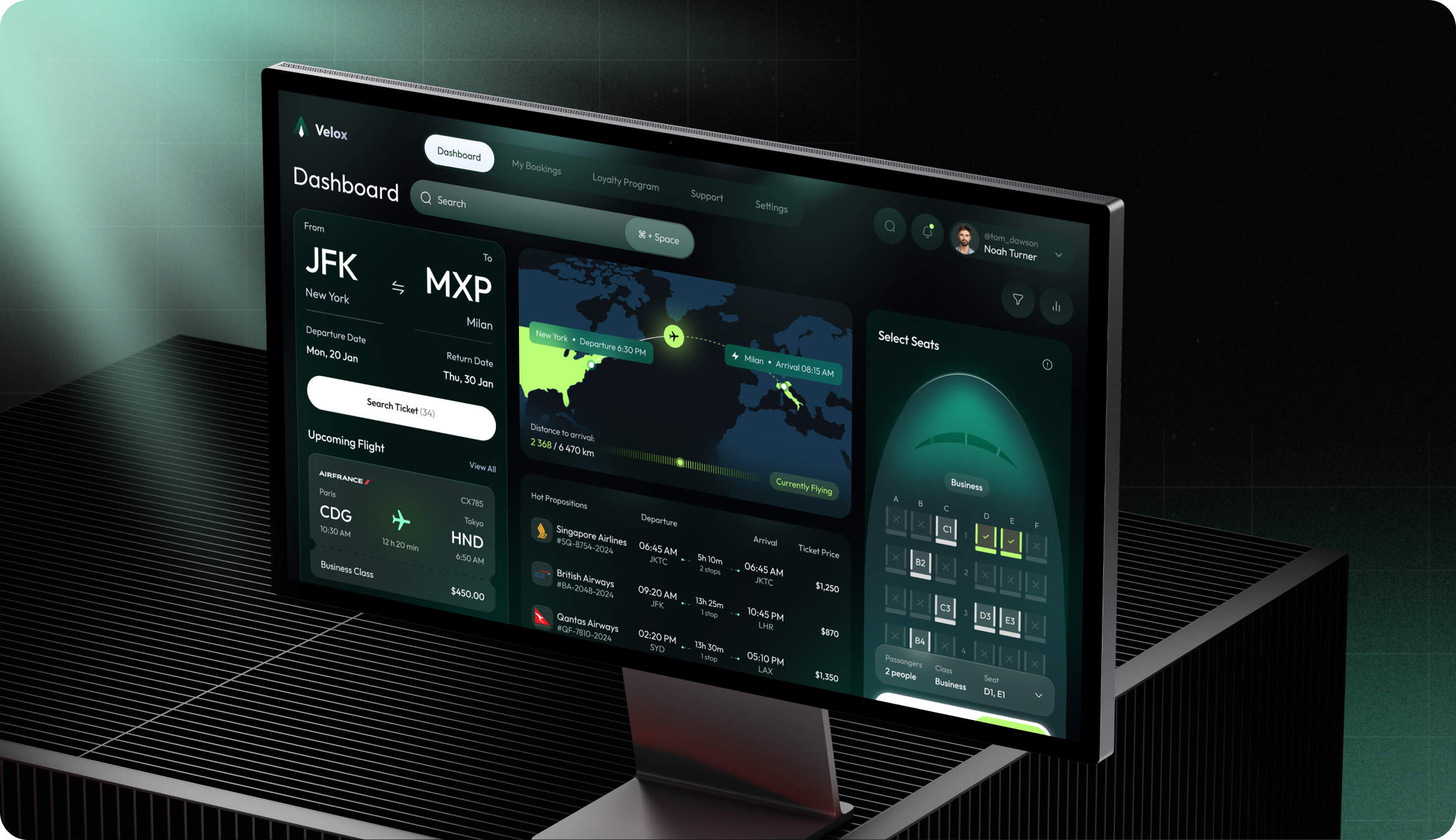 Our UI/UX designer placed flight search, airline comparison, and seat selection side by side in a dashboard for fast decision-making. We show the route visually on the map with several airline options. Their prices, durations, and stopover details sit directly below for quick comparison. The seat selection panel opens in the context of a top-down aircraft view, with color-coded availability and a checkout summary, so users never leave the dashboard to complete a booking.